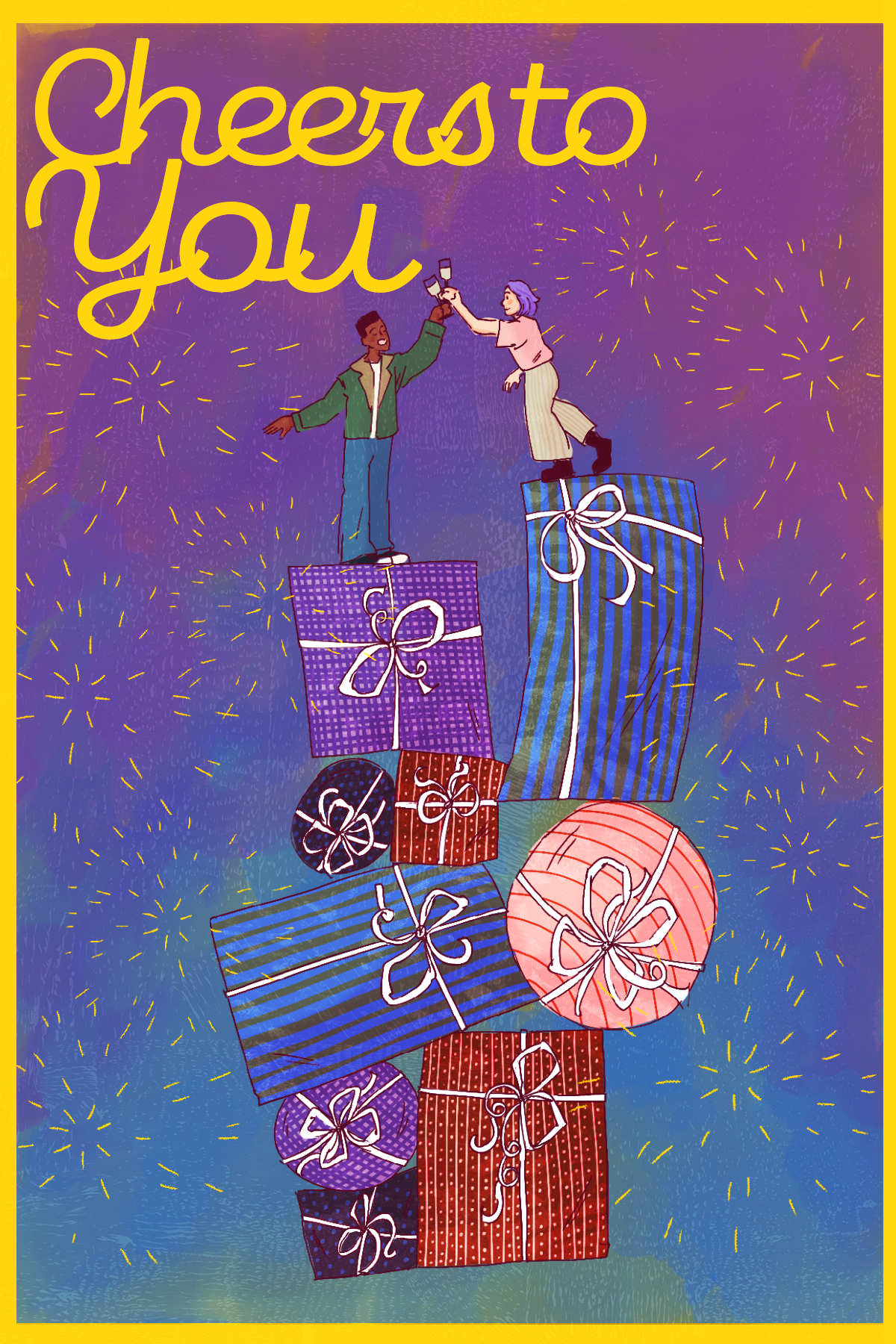 The postcard was designed similarly, however I was focused on ensuring that it was not directly related to Christmas. Being a gift for mid-January, it was important to showcase a celebratory feeling, rather than a single holiday.